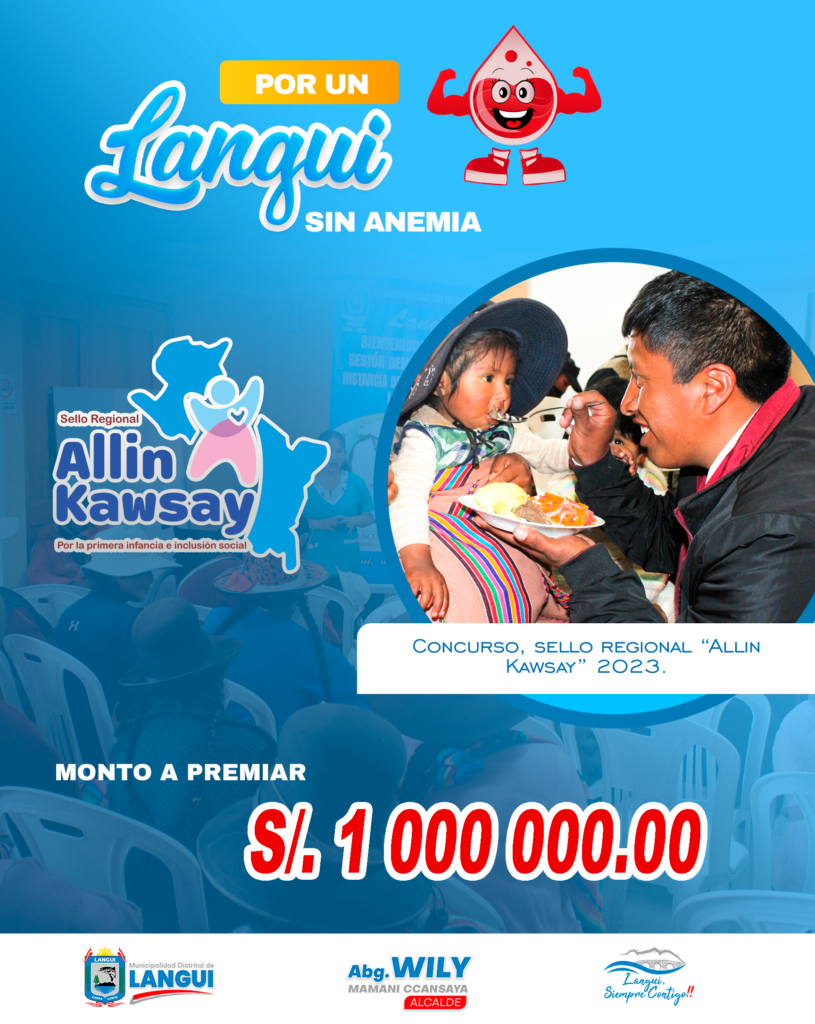 En la lucha contra la anemia y la desnutrición infantil; gracias al trabajo articulado de la Municipalidad Distrital de Langui, Puesto de Salud, Sub prefectura, Policía Nacional del Perú, programa PAÍS, programa Juntos, autoridades comunales y población en general, se ha logrado obtener un meritorio segundo lugar en el concurso sello regional por la primera infancia e inclusión social “ALLIN KAWSAY” 2023, que permitirá invertir s/. 1 000 000.00 en beneficio de nuestra primera infancia del distrito de Langui.